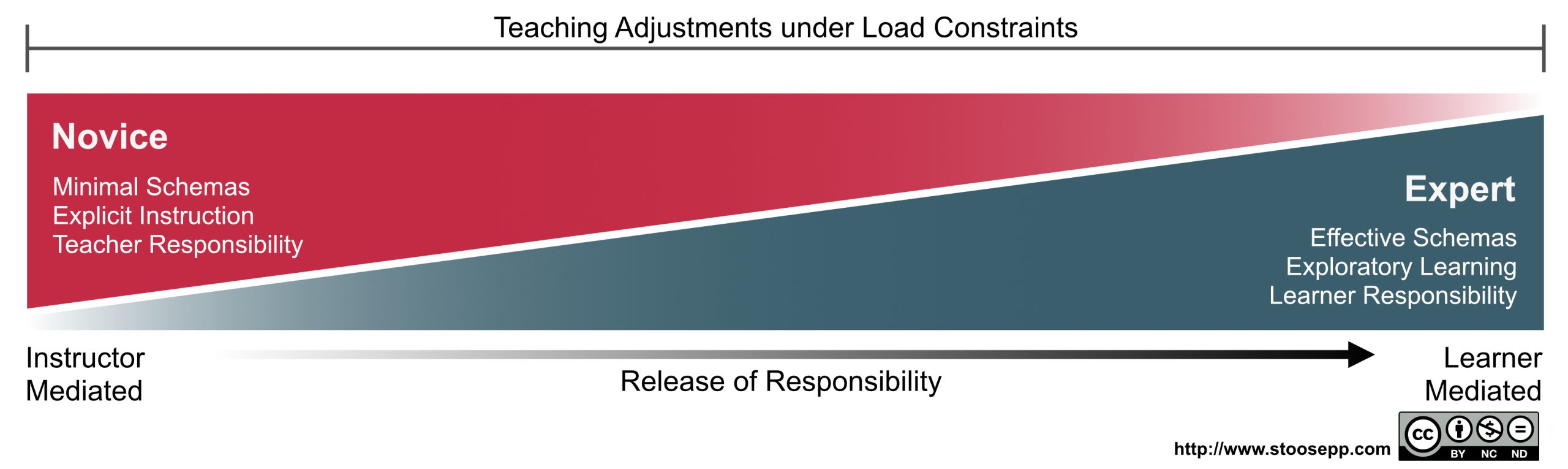 Cognitive Load Theory forms the backbone of many of the strategies (though let’s not get into translation from research to practice at this point – that’s another conversation). Foundational to this area of research is that Novices lack any sort of foundational knowledge (schemas) in the topic area that is new to them – of course they have prior knowledge in many areas, but they lack foundational knowledge in new areas to move on to more advanced tasks. To help illustrate this, I developed the following diagram to help my pre-service teacher students understand where different teaching strategies are appropriate. On the left, we have a novice, with minimal to no schemas around the new topic being learned (essentially they don’t know jack), so hugging close to the left edge of the continuum, explicit teaching, modelling and other strategies are appropriate. As learners gain foundational knowledge, they’re able to explore more and need less support, so other teaching strategies would be more appropriate. So while these models don’t make specific mention of established traditions of teaching, they 100% allow for them.