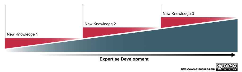Importantly, I wouldn’t call this a ‘spectrum’ as a spectrum has boundaries of where there is a start and an end. Instead, a continuum allows for iteration and step-wise development of expertise. This addresses another concern that I’ve heard from teachers – that such models force teachers to consider learners at each year / grade / level as novices, when they are absolutely not novices generally speaking because everyone has prior knowledge. They are, however, novices in topics / skills they haven’t been exposed to before. For this reason, the following diagram positions expertise development as a stepwise process, building upon prior knowledge over time, but also acknowledging that whenever we learn something brand new to us, we are novices in that new ‘thing’. For example, if I’m learning to play piano and I learn theory first, I gain expertise in music notation and other theoretical aspects. When I go to put my fingers on the keys though, this is brand new to me – I have no foundational knowledge of how to play. What I do have is that theoretical knowledge to draw upon to play that sonata, but to before I learn how to play it, I am indeed a novice and need appropriate instruction and modelling to help me learn it.
